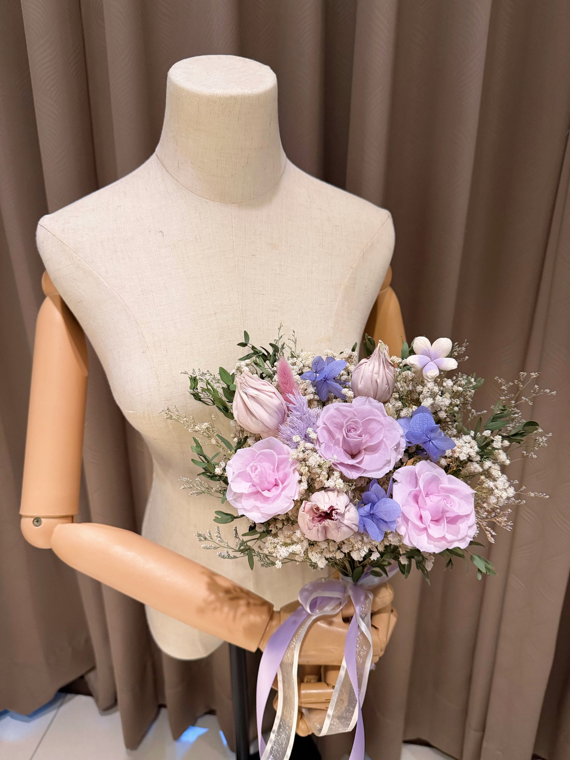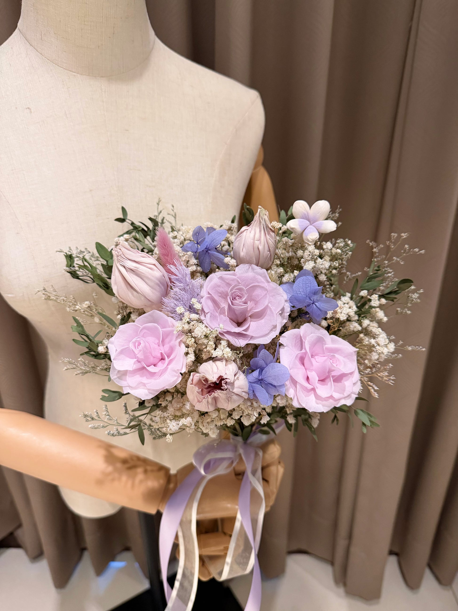 花材:永生玫瑰、永生繡球、鬱金香索拉花 及 其他永生花材